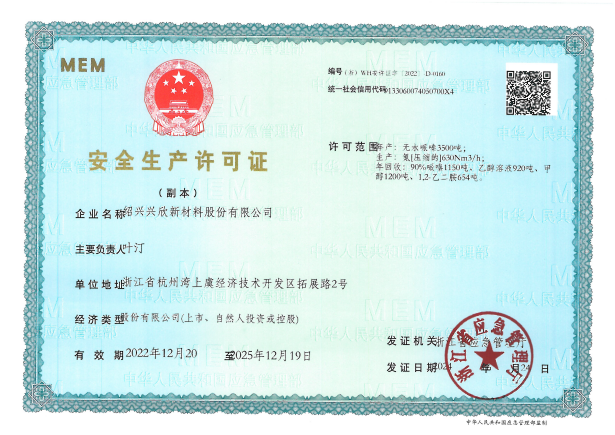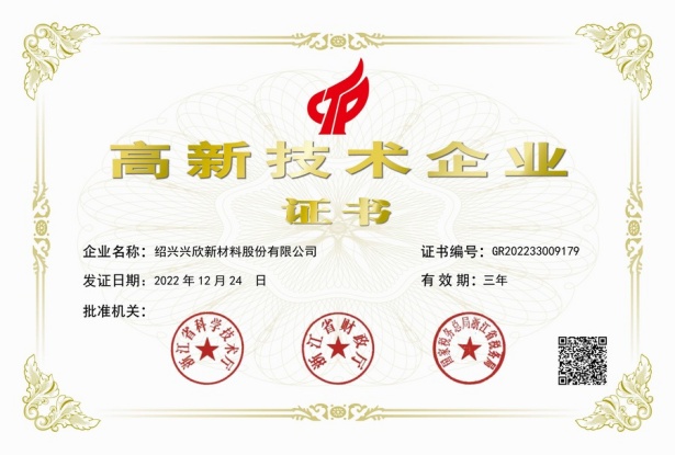 紹興興欣新材料股份有限公司成立于2002年06月27日,占地面積122畝,位于杭州灣上虞經(jīng)濟(jì)技術(shù)開發(fā)區(qū)拓展路2號,現(xiàn)有職工200余人,專業(yè)技術(shù)人員50余人;博士、碩士研究生30余人組成的一支知識型、專業(yè)化的技術(shù)科研團(tuán)隊。公司面向全球市場,專業(yè)開發(fā)電子化學(xué)品、環(huán)?;瘜W(xué)品、醫(yī)藥中間體、高分子材料等先進(jìn)新材料重點(diǎn)領(lǐng)域的省級科技型企業(yè);建有浙江上虞、安徽東至兩個生產(chǎn)基地。目前為“國家高新技術(shù)企業(yè)”、浙江省“隱形冠軍”企業(yè)、浙江省專精特新中小企業(yè);建有“省級”研究開發(fā)中心,共建天津大學(xué)浙江紹興研究院電子化學(xué)品研發(fā)中心。